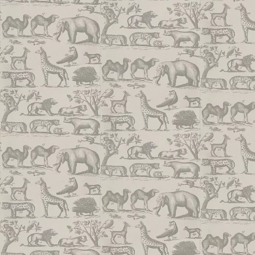 A vintage look wallpaper with animals from the jungle such as lions, snakes and elephants. Shown here in cloud grey with darker grey detailing. Other colourways are available.Part of the Museum collection.