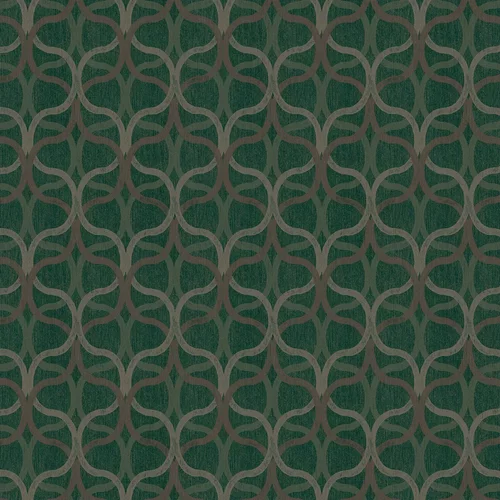 A light textured vinyl wallcovering with layers of geometric trellis and overall distressed effect. Shown in the Green colourway with metallic highlights.
