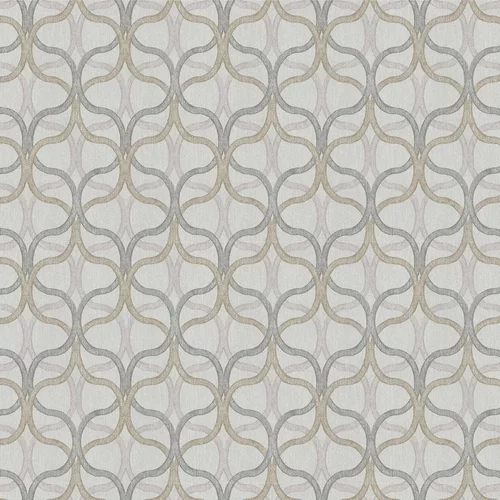 A light textured vinyl wallcovering with layers of geometric trellis and overall distressed effect. Shown in the Neutral grey / brown colourway with metallic highlights.