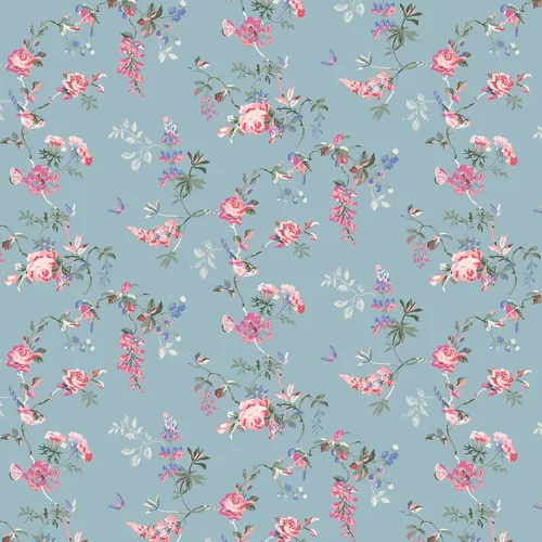 A pretty trailing design with birds and flowers created in patches of colour. Includes roses, wisteria and butterflies. Shown here in the Summer blue colourway.