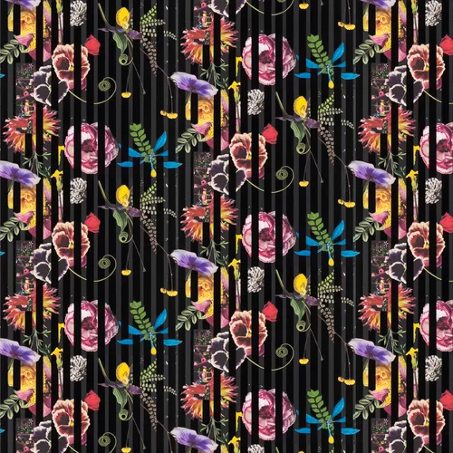 Signature Christian Lacroix florals bloom in technicolour glory feature in this digitally printed wallpaper design which is taken to a dramatic new height by the black flock over-printed stripes in varying scales. Find the secret Love message! Produced onto a luxurious non-woven ground for ease of hanging.