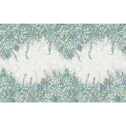 A beautiful jungle-scape or rain forest with delicate botanicals rising from the ground and cascading down this design to embrace. Shown in the soft Lagoon colourway of greens and blue with highlights of pistachio yellow on a neutral background.