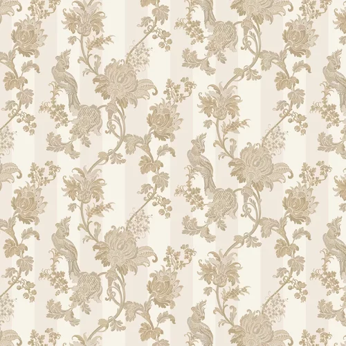 This elegant wallpaper features cockatoos and flowers in a trailing design with metallic highlights. The background has a broad but subtle two tone stripe. Shown here in gold and parchment. Other colourways available.