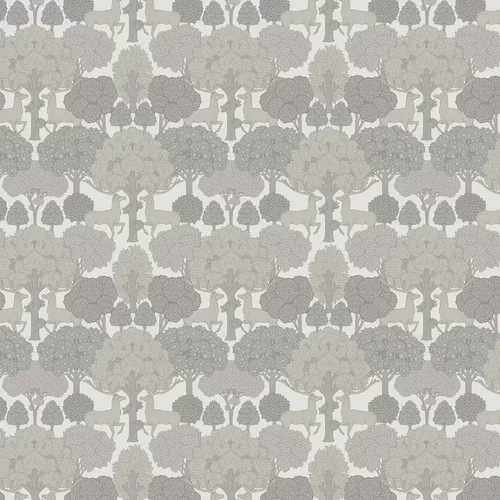 Design has a light hand painted texture effect. A stylised forest tree scene with a pleasing symmetrical pattern with two stags facing each other in rows. Shown in the light grey colourway. Search: Deer