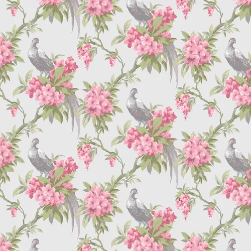 Playfully perched beautiful Pheasant birds sit amongst blooming branches, featuring vibrant flowers and trailing leaves against a contrasting background. Seen here in the Grey / Pink colourway.