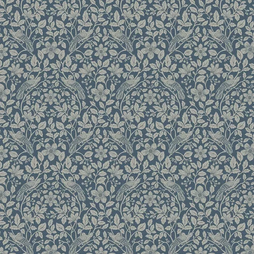 Design has a light hand painted texture effect. An arts and crafts style pattern with a lovely curving symmetry to the pattern of leaves and flowers, berries and birds. Shown in the blue colourway