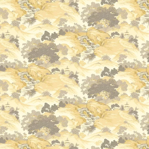 An all over rugged landscape design with oriental style trees and streams and pagoda building. Shown in the yellow colourway.