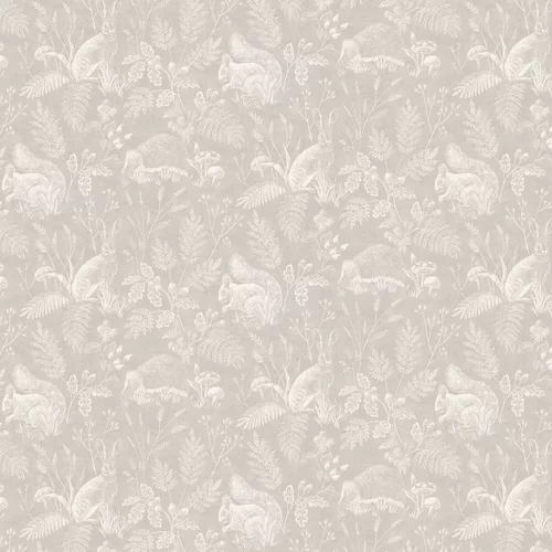 Design has a light hand painted texture effect. A woodland field with leaves, berries and toadstools with sweet animals: squirrel, bunny, rabbit or hare, hedgehog. In a pretty etching style design. Shown in the beige colourway.