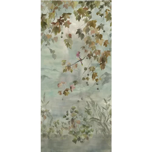 A tranquil meadow scene with trailing autumn leaves, rustling grasses, butterflies and colourful birds, all hand-painted – the illusion of depth provided by the watery soft-focus of the distant mountains. The product is sold as a single roll providing 2x 3m drops. Pattern connects with Miyako Scene 1.