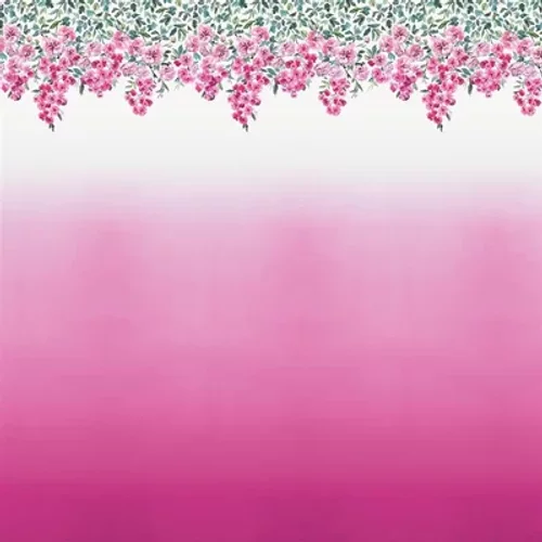 Dramatic, hand painted effect rose flowers across this panel with pretty white to peony graduated dip dye effect background. Panel size is 1.8 m wide by 3m high – supplied as 4 x 45cm wide separate lengths. .