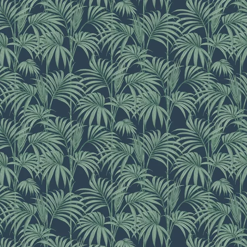 An all over palm leaf design with a metallic effect and a lightly glittered background. Shown in the navy colourway. Coordinating plain available.