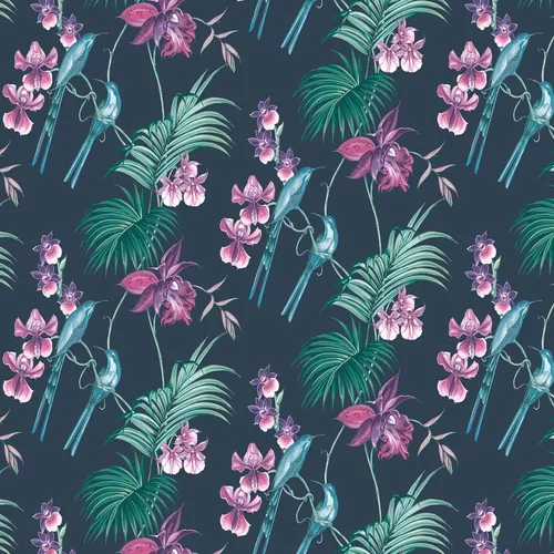 An all over pattern of beautiful blue birds perched on tropical palms and flowers. Shown here in the navy colourway with a lightly glittered background. Coordinating plain available.