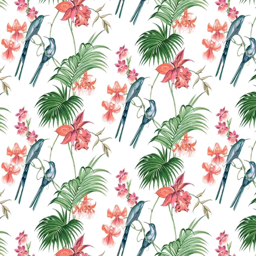 An all over pattern of beautiful green birds perched on tropical palms and flowers. Shown here in the pearl colourway with a lightly glittered background. Coordinating plain available.