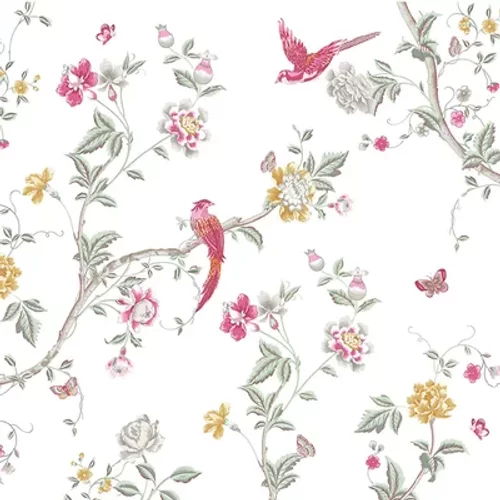 Inspired by a classic chinoiserie print from the Laura Ashley archive. Tree branches are decorated with bright pink birds and ochre flowers, giving this much loved pattern a contemporary look. This mural measures 3 metres in width x 2.8 metres in height. It is supplied as 6 referenced panels on one roll. Samples unavailable.