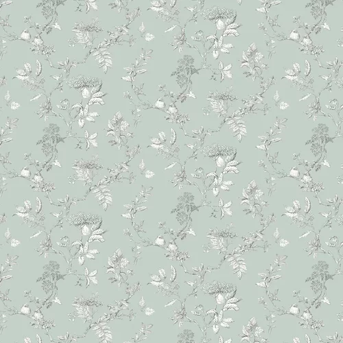 A charming all over flowering trail design with cute berries and birds nestling in the branches. Shown in the duck egg blue colourway.