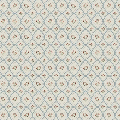 An elegant yet simplistic paper inspired by a vintage trellis print. This design adds charm to your walls, featuring sprigs of flowers and berries. Shown here in the pale seaspray blue.