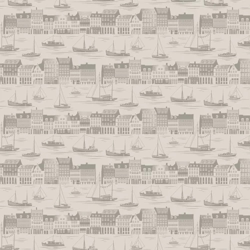 Inspired by a collection of hand-painted mid-century plates by Scandinavian artist Inger Waage, this design showcases boats sailing across colourful townhouses in the bustling town of Nyhavn. Seen here in the Weathered Cedar colourway.