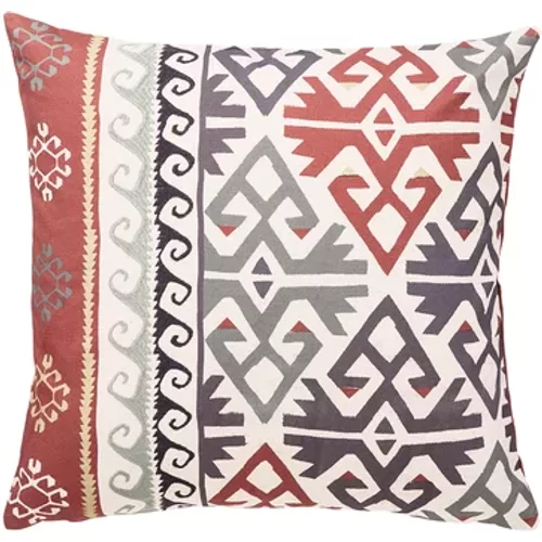 Feather-filled Crown Imperial cushion, featuring an embroidered pattern with a distinctive Eastern influence. Inspired by a kilim, the fabric is printed and embroidered to emulate a woven textile with a distinct Eastern pattern and is finished with a plain dye reverse.