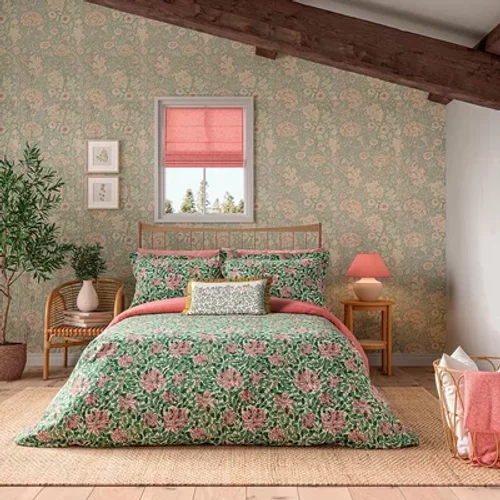 Created by May Morris, William Morris’s daughter, in 1883, Honeysuckle is a flowing, complex pattern that mimics the plant’s tendency to climb and bind. A flower of a beautifully light scent, this duvet features an uplifting Evergreen & Coral colourway. A matching Oxford pillowcase is included in the single set and a pair of Oxford pillowcases are included in the double, king and super king sets.