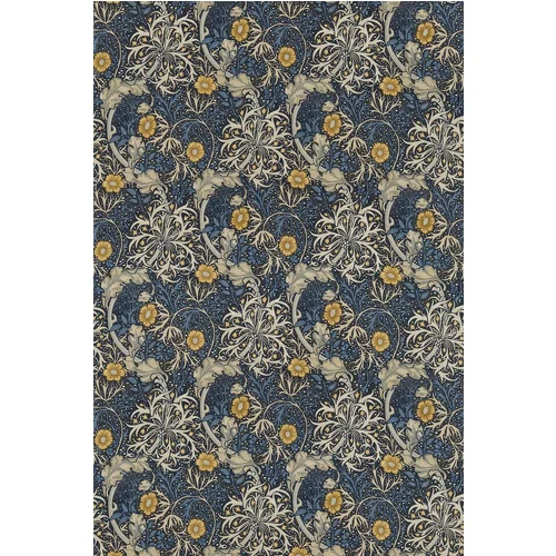 A free flowing highly decorative dramatic floral pattern, incorporating seaweed and flowers. Printed on a 100% cotton fabric. Shown here in the Ink / Woad colourway.