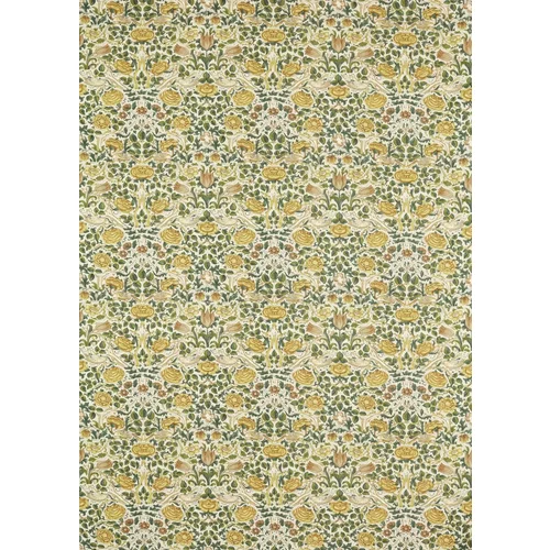 Rose is a gorgeously layered design with sumptuous rearing tulip and rose heads and dramatic thorned stems. William Morris’s close observation of nature’s everyday dramas is evidenced here in the pair of cheerful birds that play among the thicketOriginally designed by Morris as a furnishing fabric in 1883, Rose was widely used in the drawing room of Sir Emery Walker, the noted typographer and friend of Morris. Seen here in the Weld/Leaf Green colourway.