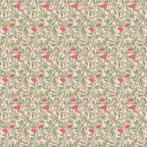 A traditional surface printed, hand painted effect wallcovering featuring trailing leaves and vibrant berries. Designed by Kathleen Kersey, a member of the Morris & Co. design studio on the eve of the First World War; this design has been reimagined in a vibrant and contemporary colour palette, whilst maintaining it’s classic William Morris character. Seen here in the Cochineal Pink colourway.