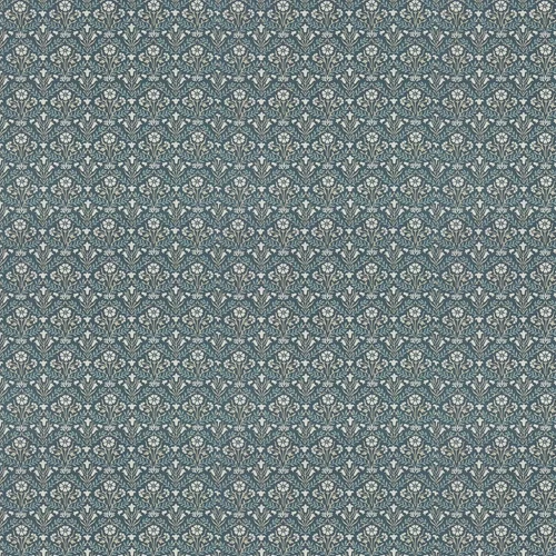 A small scale daisy motif in simple border rows – inspired by an archive Morris carpet design. Shown in the Indigo / Linen colourway with a dark blue background. Actual pattern repeat is 10.4 cm.Previously 216436