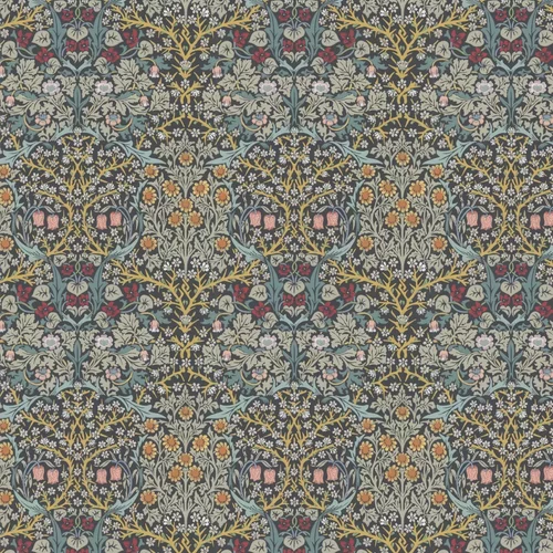 A darkly dramatic colourway of this striking all over, classic Morris flower and leaf design. Designed in 1892, this complex yet calming design works exceptionally well in small spaces, reimagined in a colourful and contrasting colour palette. Seen here in the Indigo colourway.