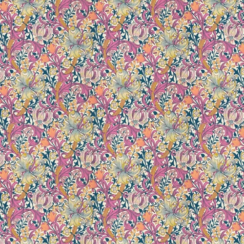 A beautiful surface printed classic wallpaper design from William Morris. Shown here the exuberant all over floral lily design with its mix of flowers. Created in the vibrant pink fizz colourway.