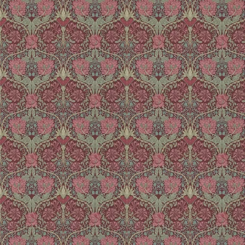 From 1876, this early Morris design creates a trellis effect with large tulips and stylised honeysuckle. Shown here in the Burgundy / Sage, red and green colourway. Wide width wallpaper.