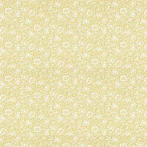 An all over elegant floral pattern representing Mallow flowers and leaves. Shown in the soft Weld yellow colourway. Actual pattern repeat is 30.5 cm or 12 inches.