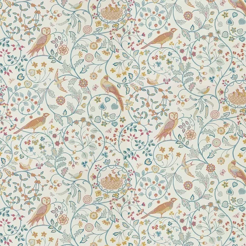 A delightful trailing leaf and berry design with nesting birds, owls, and pheasants inspired by an embroidered bedcover. Shown in the Indigo Saffron colourway. Wide width product with a long pattern repeat and an offset match.
