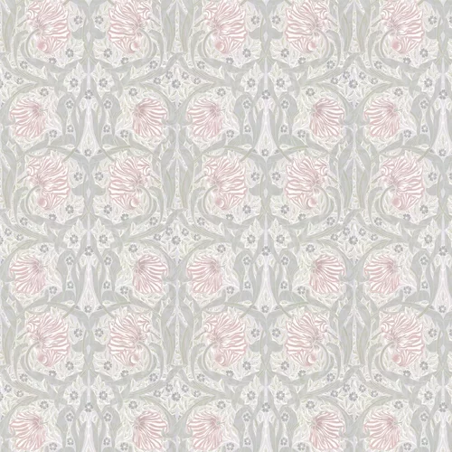 A stunningly beautiful classic Morris style floral trellis with circular shapes and a strong symmetrical pattern within the leaves. Shown in soft shades of grey, green and blossom pink on a pale mist grey background – available in other colours. An exclusive colourway, created exclusively on a non-woven paper.