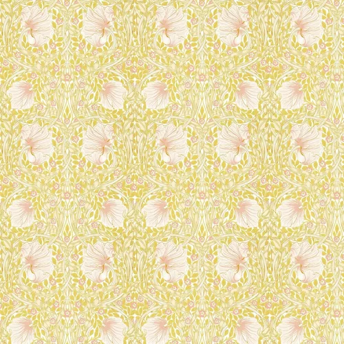 A stunningly beautiful classic Morris style floral trellis with circular shapes and a strong symmetrical pattern within the leaves. Shown in the warm Sunflower / Pink colourway,