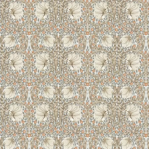 A stunningly beautiful classic Morris style floral trellis with circular shapes and a strong symmetrical pattern within the leaves. Shown here in the Linen / Coral colourway.