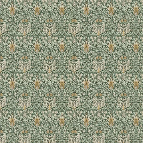 A delightful decorative design inspired by groups of three snakeshead fritillary flowers, giving a pleasing symmetry to the pattern. Based on the original archive 1876 design. Forest / Thyme green colourway. Wide width product.Previously 216427