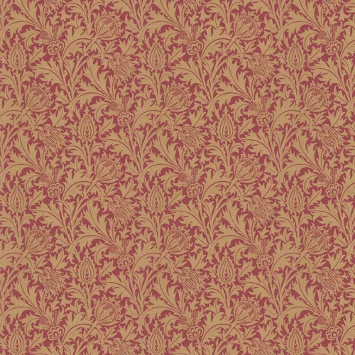 A bold print by John Henry Dearle who joined Morris & Co in 1878, later becoming its chief designer. Neo-Gothic in influence with large-scale symmetrical flower heads framed by gently scrolling acanthus leaves. Shown here in metallic gold on a deep claret red. An exclusive colourway, created exclusively on a non-woven paper.