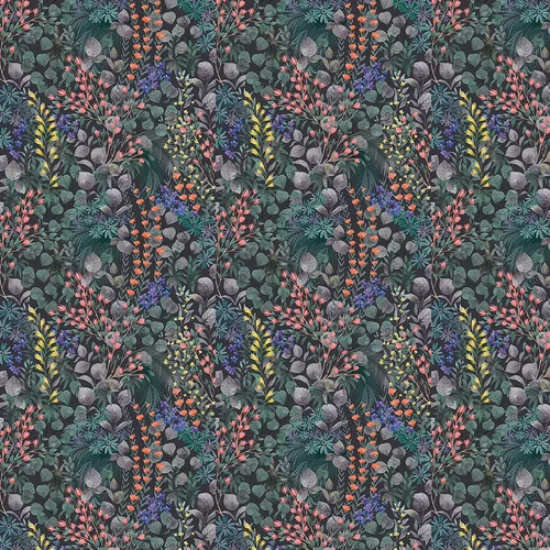 A striking floral design with tropical jungle influences. The bright colour palette is offset against a black background.