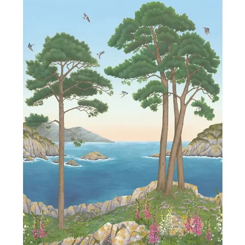 A coastal scene of majestic cedar trees, on a headland dotted with foxgloves, overlooking a bay with rocky islands. Designed for Osborne & Little by Joanna Charlotte. This mural has been designed as three separate panels each 300cm (118ins) in length and 70cm (27.5ins) wide, which when joined make a total width of 210cm (82.7ins). Printed on a single roll, repeatable sideways.