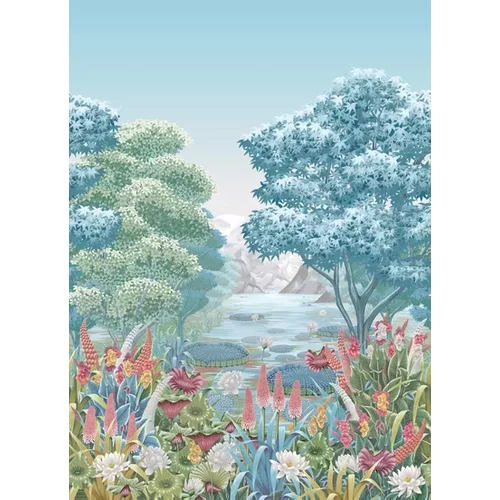 A beautiful vista of a lake with mountains in the distance, colourful aquatic plants to the fore, all viewed between two trees painted in a stylistic manner.A 3x panel mural, total WxH dimensions 210 x 300cm supplied on a roll 70cm wide.