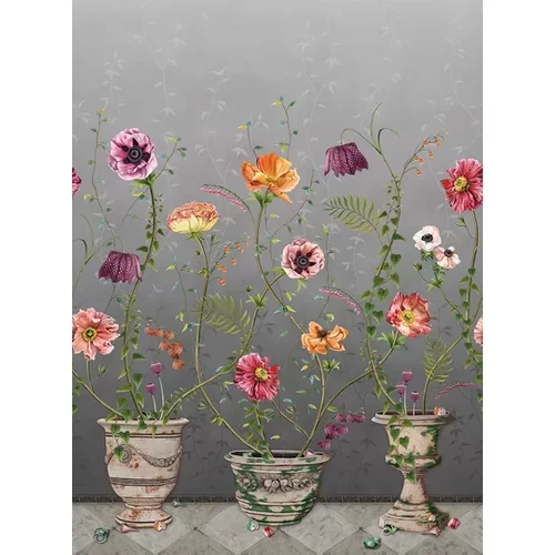 Exaggerated blooms of fritillaria, poppies, anemones, and creeping vines grow from terracotta urns, set against a lime-washed wall, with a tiled stone floor scattered with colourful shells. This mural has been designed as three separate panels each 300cm (118ins) in length and 70cm (27.5ins) wide, which when joined make a total width of 210cm (82.7ins). Printed on a single roll, repeatable sideways.