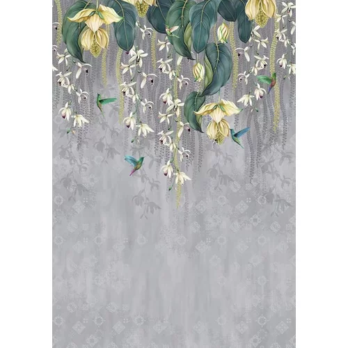 Larger than life orchids trail downwards from on high while exotically plumed hummingbirds dart beneath. Shown here in a lemon and watery grey colourway. The mural shown comprises three separate panels each 70cm wide and 3m tall.