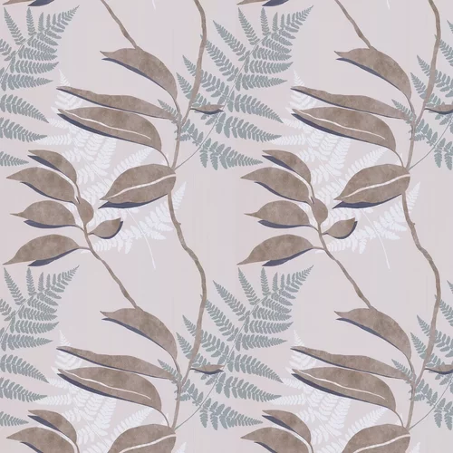 A trailing design of metallic gilver leaves with charcoal shadows overlaid on flat prints of fern leaves against a stone background. This is a wide width wallpaper.
