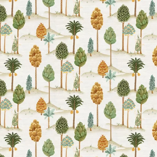 In various shades of green with golden accents, look out over rolling hills to find a depiction of stylised Indian trees. Seen here in the Olive / Gold colourway.