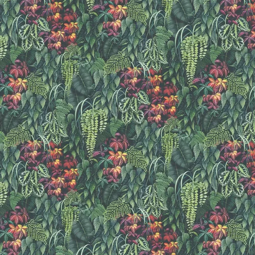 A wall of cascading sub-tropical plants; deep green and variegated leaves punctuated by splashes of rusty reds and autumnal yellows, vibrant and luscious, a variety of shapes and sizes, ranging from large strong flat to delicate tiny clusters.