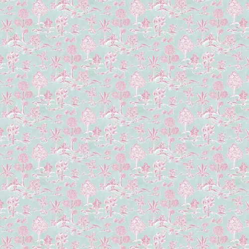 A reimagination of a classic toile design with influence from Greek ornamental gardens, rich in sculpture and lush foliage. Seen here in the Aqua / Raspberry colourway.