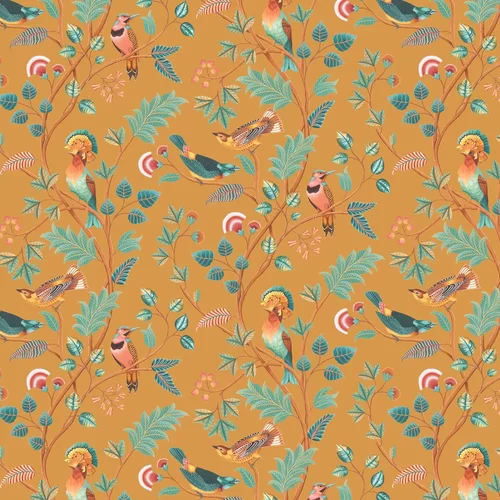 Intricately painted decorative birds perched atop leafy trailing branches. Named after the famous Mayani Bird Sanctuary in India. This colourway featuring a striking gold metallic background. Seen here in the Metallic Gold colourway.