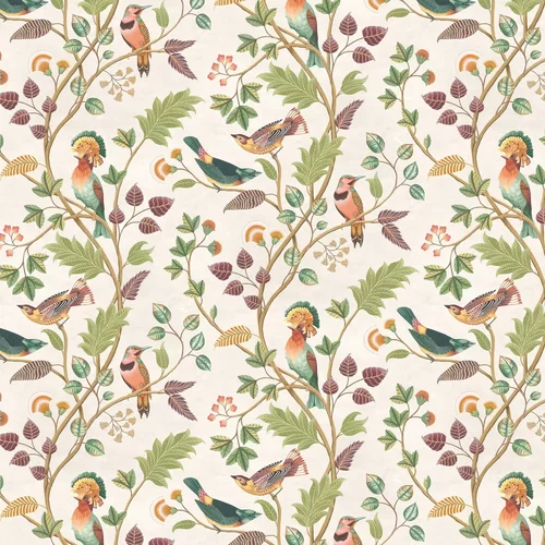 Intricately painted decorative birds perched atop leafy trailing branches. Named after the famous Mayani Bird Sanctuary in India. Seen here in the Olive colourway.