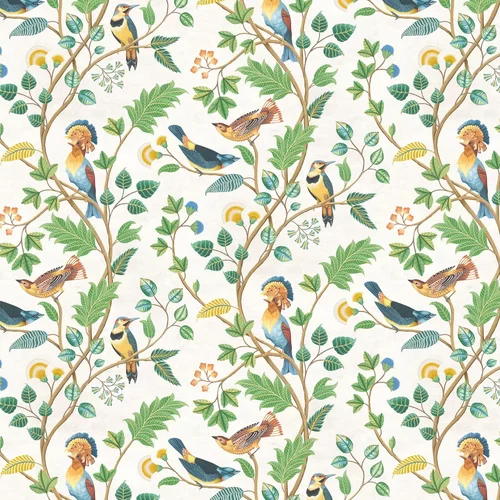 Intricately painted decorative birds perched atop leafy trailing branches. Named after the famous Mayani Bird Sanctuary in India. Seen here in the Apple colourway.