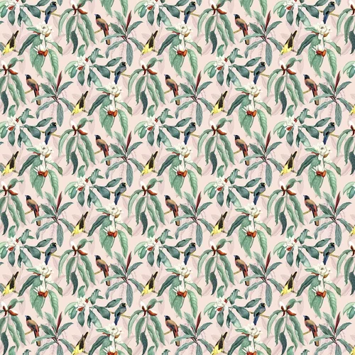 A striking watercolour design with exotic birds nestled in the branches of a magnolia tree. Pencil drawn leaves in the background give this design added depth and dimension. Shown here in the Blush colourway.